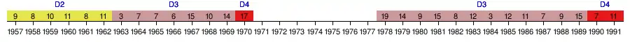 | 1957 | 2e Extrême-Orient | 9e | 16 | 22 | 5 | 6 | 11 | 32 | 41 | -9 | |