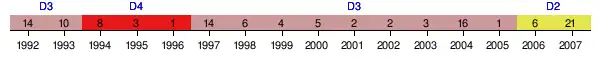 | 2002 | 2e | 68 | 28 | 22 | 2 | 4 | 59 | 12 | +47 | Deuxième tour | |