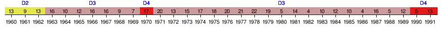 | 1971 | 3e Zone 4 | 20e | 25 | 38 | 7 | 11 | 20 | 24 | 40 | -161 | |