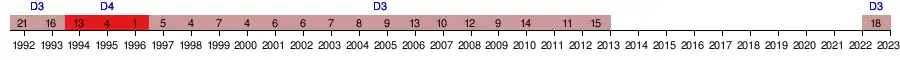 | 2005 | 9e | 46 | 34 | 14 | 4 | 16 | 35 | 36 | -1 | Quatrième tour | |