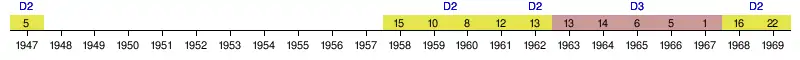 | 1969 | 2e Groupe 2 | 22e | 26 | 34 | 7 | 12 | 15 | 22 | 35 | -13 | 64es de finale |