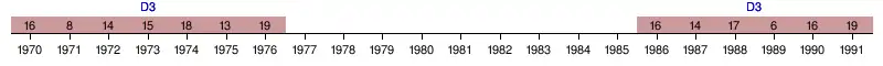 | 1993 | 3e Zone 3 | 9e | 33 | 34 | 11 | 11 | 12 | 27 | 30 | -3 | |