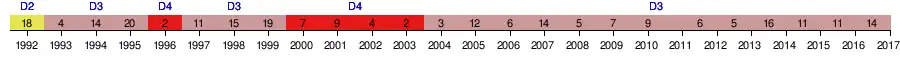 | 1994 | 3e Ouest | 14e | 32 | 40 | 13 | 6 | 21 | 40 | 70 | -30 | Deuxième tour |