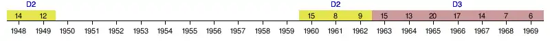 | 1949 | 2e Russie 3 | 12e | 15 | 24 | 5 | 5 | 14 | 33 | 60 | -27 | Deuxième tour Q |