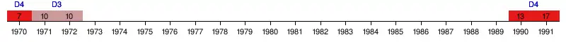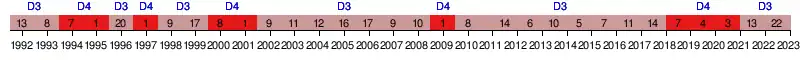 | 1991 | 4e Zone 7 | 17e | 33 | 42 | 12 | 9 | 21 | 50 | 55 | -5 | |