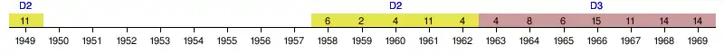 | 1965 | 6e | 43 | 36 | 17 | 9 | 10 | 43 | 25 | +18 | — | |