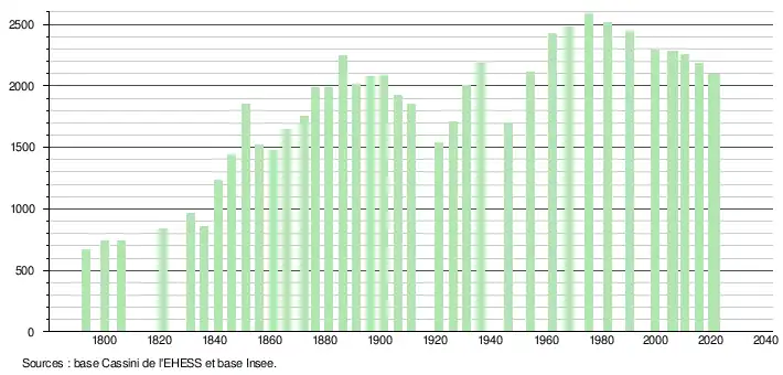 L'évolution du nombre d'habitants est connue à travers les recensements de la population effectués dans la commune depuis 1793. Pour les communes de moins de 10 000 habitants, une enquête de recensement portant sur toute la population est réalisée tous les cinq ans, les populations légales des années intermédiaires étant quant à elles estimées par interpolation ou extrapolation[23]. Pour la commune, le premier recensement exhaustif entrant dans le cadre du nouveau dispositif a été réalisé en 2005[24].