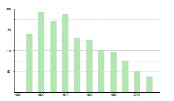 | 1930 | 171 | ▼ −10,94 % | |