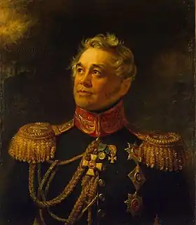 - Grigori Alexeïevitch (1735-1810), fils du précédent, en 1764, il épousa Ielena Vassilievna Plokhova (1739-1766), un enfant naquit de cette union : Konstantin Grigorievitch († 1766), veuf, en 1775, il épousa Anastasia Nikolaïevna Dolgoroukova (1750-1810). Neuf enfants naquirent de cette union : Alexeï Grigorievitch, Sofia Grigorievna (1776-1849), en 1797, elle épousa Piotr Andreïevitch Chouvalov (1771-1808), Nikolaï Grigorievitch, Sergueï Grigorievitch (1779-1855), conseiller privé (1834), il épousa Anna Mikhaïlovna Khilkova (1799-1868), Vladimir Grigorievitch (1781-1805), Anna Grigorievna (1785-1821), elle épousa Fiodor Nikolaïevitch Petrovo-Solovov (1763-1826), Iekaterina Grigorievna (1746-1848), elle épousa Gavriil Petrovitch Apoukhtin (1784-?), Natalia Grigorievna (1788-?), elle épousa Iakov Fiodorovitch Skariatine († 1850), Ielizaveta Grigorievna (1790-?), elle épousa Stepan Fiodorovitch Berkhman (1778-?)[10]. Le prince Alexeï Grigorievitch Chtcherbatov, portrait de George Dawe, galerie militaire, Musée de l'Ermitage à Saint-Pétersbourg Le prince Alexeï Grigorievitch Chtcherbatov, portrait de George Dawe, galerie militaire, Musée de l'Ermitage à Saint-Pétersbourg- Nikolaï Grigorievitch (1778-1845), fils du précédent, major-général, il prit part aux Guerres napoléoniennes. En 1817, il épousa Anna Grigorievna Efimova (1789-1849), de cette union naquirent : Zinaïda Nikolaïevna († 1867), Natalia Nikolaïevna, Anastasia Nikolaïevna, elle épousa Fiodor Alexandrovitch Ermolov, Maria Nikolaïevna († 1892), elle épousa Alexeï Borissovitch Tcherkasski (1803-1855).