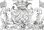 De gueules, fretté de six lances d'or, les claires-voies semées d'écussons du mesme, à un écusson d'azur, brochant en cœur et chargé d'une fleur-de-lis d'or.[11]