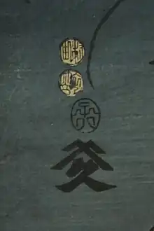 - À partir de son accession au nom Toyokuni en 1844, Kunisada a toujours signé ses œuvres Toyokuni II, refusant d'accepter la légitimité de son prédécesseur, Toyokuni II. Il est, cependant, toujours dénommé Toyokuni III (Marks, 2010, p. 120).