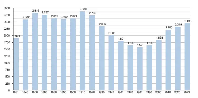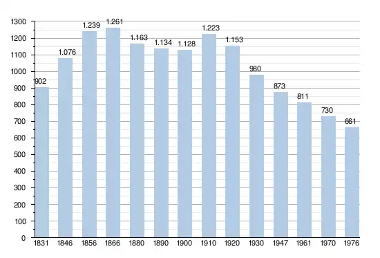 Les chiffres des années 1831 à 1970 tiennent compte des chiffres des anciennes communes fusionnées.