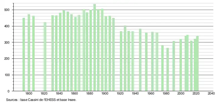 L'évolution du nombre d'habitants est connue à travers les recensements de la population effectués dans la commune depuis 1793. Pour les communes de moins de 10 000 habitants, une enquête de recensement portant sur toute la population est réalisée tous les cinq ans, les populations légales des années intermédiaires étant quant à elles estimées par interpolation ou extrapolation[19]. Pour la commune, le premier recensement exhaustif entrant dans le cadre du nouveau dispositif a été réalisé en 2008[20].
