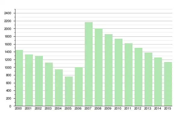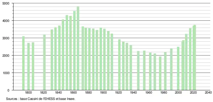 L'évolution du nombre d'habitants est connue à travers les recensements de la population effectués dans la commune depuis 1793. Pour les communes de moins de 10 000 habitants, une enquête de recensement portant sur toute la population est réalisée tous les cinq ans, les populations légales des années intermédiaires étant quant à elles estimées par interpolation ou extrapolation[22]. Pour la commune, le premier recensement exhaustif entrant dans le cadre du nouveau dispositif a été réalisé en 2005[23].