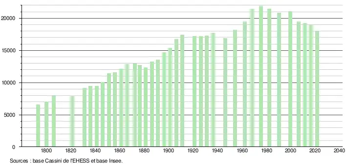 - Par convention dans Wikipédia, le principe a été retenu de n’afficher dans le tableau des recensements et le graphique, pour les populations légales postérieures à 1999, que les populations correspondant à une enquête exhaustive de recensement pour les communes de moins de 10 000 habitants, et que les populations des années 2006, 2011, 2016, etc. pour les communes de plus de 10 000 habitants, ainsi que la dernière population légale publiée par l’Insee pour l'ensemble des communes.