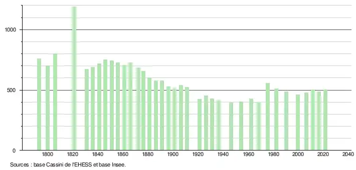 L'évolution du nombre d'habitants est connue à travers les recensements de la population effectués dans la commune depuis 1793. Pour les communes de moins de 10 000 habitants, une enquête de recensement portant sur toute la population est réalisée tous les cinq ans, les populations légales des années intermédiaires étant quant à elles estimées par interpolation ou extrapolation[26]. Pour la commune, le premier recensement exhaustif entrant dans le cadre du nouveau dispositif a été réalisé en 2006[27].