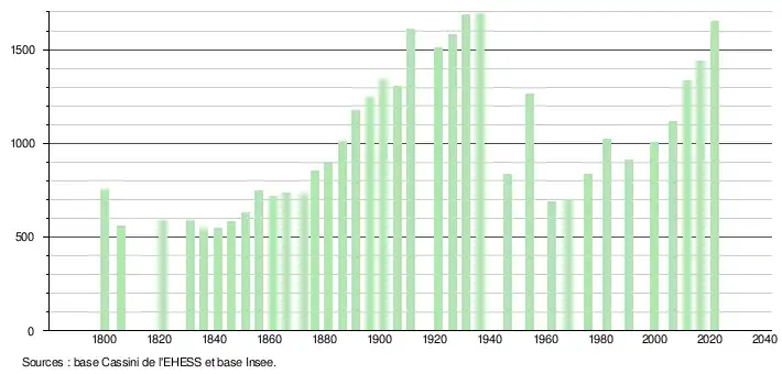 L'évolution du nombre d'habitants est connue à travers les recensements de la population effectués dans la commune depuis 1800. Pour les communes de moins de 10 000 habitants, une enquête de recensement portant sur toute la population est réalisée tous les cinq ans, les populations légales des années intermédiaires étant quant à elles estimées par interpolation ou extrapolation[12]. Pour la commune, le premier recensement exhaustif entrant dans le cadre du nouveau dispositif a été réalisé en 2006[13].