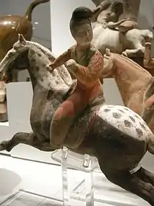 La société Tang, du moins à Chang'an, la capitale[45] était très cosmopolite et tirait une grande partie de sa prospérité de la Route de la soie. Les étrangers venus de l'ouest semblent avoir été courants comme domestiques, en particulier comme palefreniers pour chevaux et conducteurs de chameaux qui étaient le principal moyen de transport sur la route de la soie terrestre. L'art Tang aimait représenter des personnages étrangers, généralement des hommes, avec des caractéristiques standard pour leurs visages et leurs vêtements. Les types persans et sogdiens peuvent être distingués, à la fois avec de grandes barbes touffues et des expressions souvent féroces et vigoureuses[46] Ces figures contiennent parfois des éléments clairs de caricature[47].