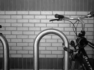 ![]() Image en nuances de gris d'un mur de briques et d'un râtelier à vélo |