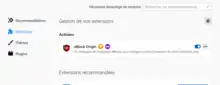 Firefox 112 sous Ubuntu (2023). Thème sombre et extensions installées.