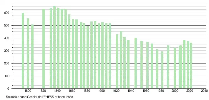 L'évolution du nombre d'habitants est connue à travers les recensements de la population effectués dans la commune depuis 1793. Pour les communes de moins de 10 000 habitants, une enquête de recensement portant sur toute la population est réalisée tous les cinq ans, les populations légales des années intermédiaires étant quant à elles estimées par interpolation ou extrapolation[17]. Pour la commune, le premier recensement exhaustif entrant dans le cadre du nouveau dispositif a été réalisé en 2007[18].