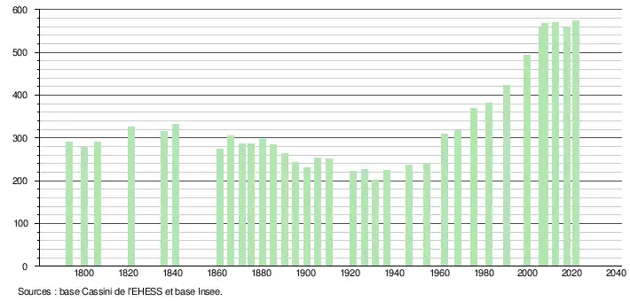 L'évolution du nombre d'habitants est connue à travers les recensements de la population effectués dans la commune depuis 1793. Pour les communes de moins de 10 000 habitants, une enquête de recensement portant sur toute la population est réalisée tous les cinq ans, les populations légales des années intermédiaires étant quant à elles estimées par interpolation ou extrapolation[21]. Pour la commune, le premier recensement exhaustif entrant dans le cadre du nouveau dispositif a été réalisé en 2007[22].