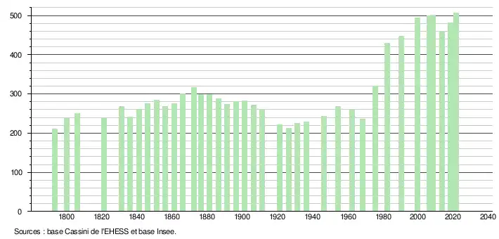 L'évolution du nombre d'habitants est connue à travers les recensements de la population effectués dans la commune depuis 1793. Pour les communes de moins de 10 000 habitants, une enquête de recensement portant sur toute la population est réalisée tous les cinq ans, les populations légales des années intermédiaires étant quant à elles estimées par interpolation ou extrapolation[14]. Pour la commune, le premier recensement exhaustif entrant dans le cadre du nouveau dispositif a été réalisé en 2008[15].