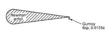 « Liebeck conducted wind tunnel tests on the effect of a 1.25% chord height Gurney flap. He used a Newman-type airfoil, which had an elliptic nose and a straight line wedge for the rear section. »