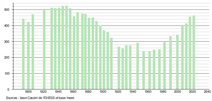 L'évolution du nombre d'habitants est connue à travers les recensements de la population effectués dans la commune depuis 1793. Pour les communes de moins de 10 000 habitants, une enquête de recensement portant sur toute la population est réalisée tous les cinq ans, les populations légales des années intermédiaires étant quant à elles estimées par interpolation ou extrapolation[23]. Pour la commune, le premier recensement exhaustif entrant dans le cadre du nouveau dispositif a été réalisé en 2006[24].