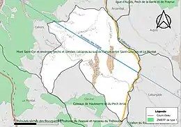 L’inventaire des zones naturelles d'intérêt écologique, faunistique et floristique (ZNIEFF) a pour objectif de réaliser une couverture des zones les plus intéressantes sur le plan écologique, essentiellement dans la perspective d’améliorer la connaissance du patrimoine naturel national et de fournir aux différents décideurs un outil d’aide à la prise en compte de l’environnement dans l’aménagement du territoire. Deux ZNIEFF de type 1[Note 1] sont recensées sur la commune[15] : les « coteaux de Hauteserre et du pech Arras » (129 ha), couvrant 3 communes du département[16] et le « Mont Saint-Cyr et environs, pechs et combes calcaires au sud de Cahors entre Saint-Georges et le Montat » (1 853 ha), couvrant 5 communes du département[17].