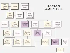 | T. Flavius Sabinus IV cos en 82 | Julia Flavia | T. Flavius Clemens ~ 50 - 95 | Flavia Domitilla fl. 97 | ||||||||||||||||||||||||||||||||||||||||||||||||||||||||||||||