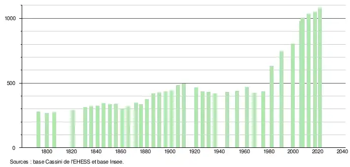 L'évolution du nombre d'habitants est connue à travers les recensements de la population effectués dans la commune depuis 1793. Pour les communes de moins de 10 000 habitants, une enquête de recensement portant sur toute la population est réalisée tous les cinq ans, les populations légales des années intermédiaires étant quant à elles estimées par interpolation ou extrapolation[30]. Pour la commune, le premier recensement exhaustif entrant dans le cadre du nouveau dispositif a été réalisé en 2007[31].