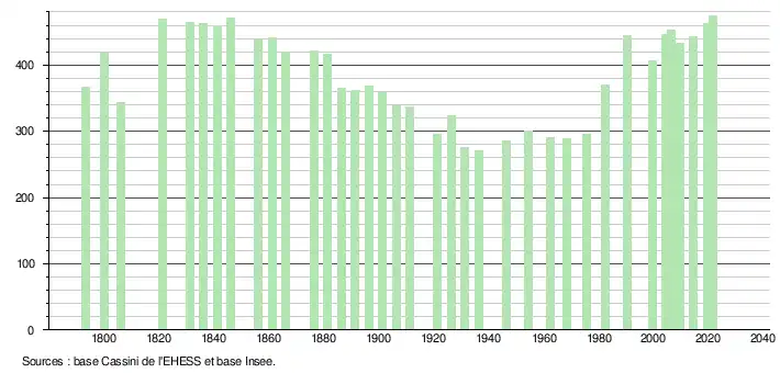 L'évolution du nombre d'habitants est connue à travers les recensements de la population effectués dans la commune depuis 1793. Pour les communes de moins de 10 000 habitants, une enquête de recensement portant sur toute la population est réalisée tous les cinq ans, les populations légales des années intermédiaires étant quant à elles estimées par interpolation ou extrapolation[17]. Pour la commune, le premier recensement exhaustif entrant dans le cadre du nouveau dispositif a été réalisé en 2004[18].