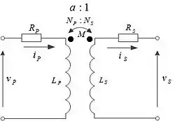 Un transformateur linéaire non idéal à deux enroulements peut être représenté par deux boucles de circuit à couplage d'inductance mutuelle reliant les cinq constantes d'impédance du transformateur, comme le montre la figure 2[7],[17],[18],[19] :