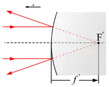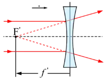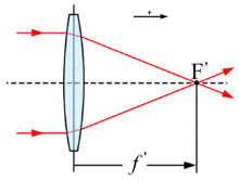 Il s'agit d'une distance algébrique dont le signe est déterminé par la convention classique en optique : toutes les distances sont positives lorsqu'elles sont orientées dans le sens de la propagation de la lumière. Ainsi, les systèmes optiques divergents ont une focale négative, tandis que les systèmes optiques convergents ont une focale positive[1]. La focale est liée à la vergence, cette dernière tenant compte de l'indice de réfraction du milieu.