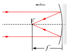 Pour un miroir sphérique, les foyers image et objet sont confondus, et ainsi les distances focales objet et image sont identiques[4] : où est le sommet du miroir sphérique et son centre.