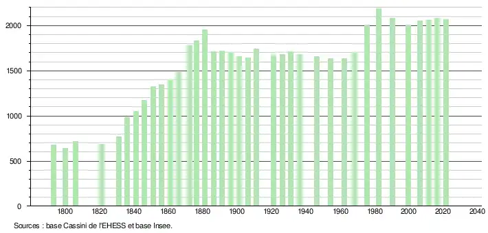 L'évolution du nombre d'habitants est connue à travers les recensements de la population effectués dans la commune depuis 1793. Pour les communes de moins de 10 000 habitants, une enquête de recensement portant sur toute la population est réalisée tous les cinq ans, les populations légales des années intermédiaires étant quant à elles estimées par interpolation ou extrapolation[20]. Pour la commune, le premier recensement exhaustif entrant dans le cadre du nouveau dispositif a été réalisé en 2006[21].