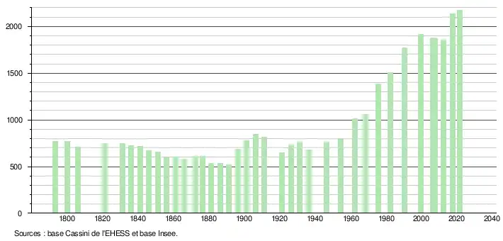 L'évolution du nombre d'habitants est connue à travers les recensements de la population effectués dans la commune depuis 1793. Pour les communes de moins de 10 000 habitants, une enquête de recensement portant sur toute la population est réalisée tous les cinq ans, les populations légales des années intermédiaires étant quant à elles estimées par interpolation ou extrapolation[31]. Pour la commune, le premier recensement exhaustif entrant dans le cadre du nouveau dispositif a été réalisé en 2007[32].
