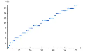 L’image ci-contre illustre la fonction π(n) pour les valeurs entières de la variable. Elle met en évidence les augmentations de 1 que la fonction subit à chaque fois que x est égal à un nombre premier.