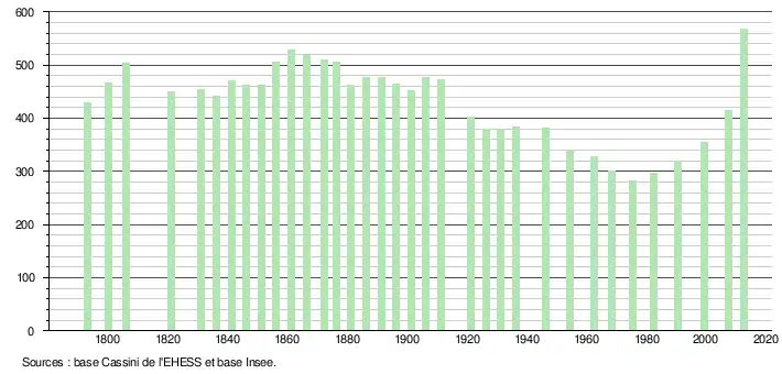 L'évolution du nombre d'habitants est connue à travers les recensements de la population effectués dans la commune depuis 1793. À partir du , les populations légales des communes sont publiées annuellement dans le cadre d'un recensement qui repose désormais sur une collecte d'information annuelle, concernant successivement tous les territoires communaux au cours d'une période de cinq ans. Pour les communes de moins de 10 000 habitants, une enquête de recensement portant sur toute la population est réalisée tous les cinq ans, les populations légales des années intermédiaires étant quant à elles estimées par interpolation ou extrapolation[10]. Pour la commune, le premier recensement exhaustif entrant dans le cadre du nouveau dispositif a été réalisé en 2007[11],[Note 1].