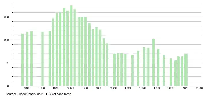 L'évolution du nombre d'habitants est connue à travers les recensements de la population effectués dans la commune depuis 1793. Pour les communes de moins de 10 000 habitants, une enquête de recensement portant sur toute la population est réalisée tous les cinq ans, les populations légales des années intermédiaires étant quant à elles estimées par interpolation ou extrapolation[26]. Pour la commune, le premier recensement exhaustif entrant dans le cadre du nouveau dispositif a été réalisé en 2005[27].