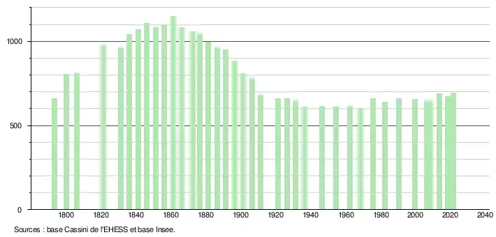 L'évolution du nombre d'habitants est connue à travers les recensements de la population effectués dans la commune depuis 1793. Pour les communes de moins de 10 000 habitants, une enquête de recensement portant sur toute la population est réalisée tous les cinq ans, les populations légales des années intermédiaires étant quant à elles estimées par interpolation ou extrapolation[16]. Pour la commune, le premier recensement exhaustif entrant dans le cadre du nouveau dispositif a été réalisé en 2008[17].