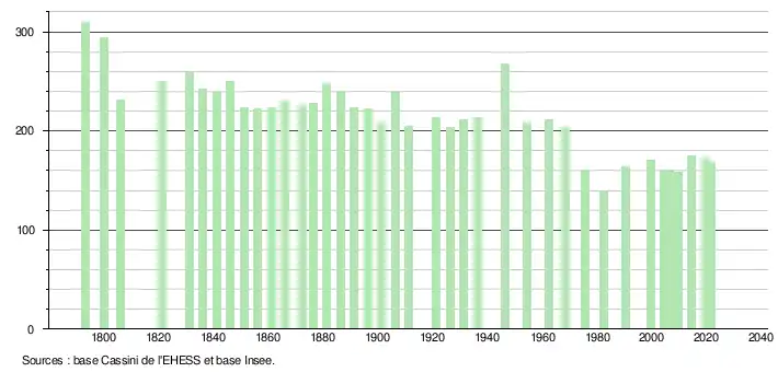 L'évolution du nombre d'habitants est connue à travers les recensements de la population effectués dans la commune depuis 1793. Pour les communes de moins de 10 000 habitants, une enquête de recensement portant sur toute la population est réalisée tous les cinq ans, les populations légales des années intermédiaires étant quant à elles estimées par interpolation ou extrapolation[19]. Pour la commune, le premier recensement exhaustif entrant dans le cadre du nouveau dispositif a été réalisé en 2004[20].