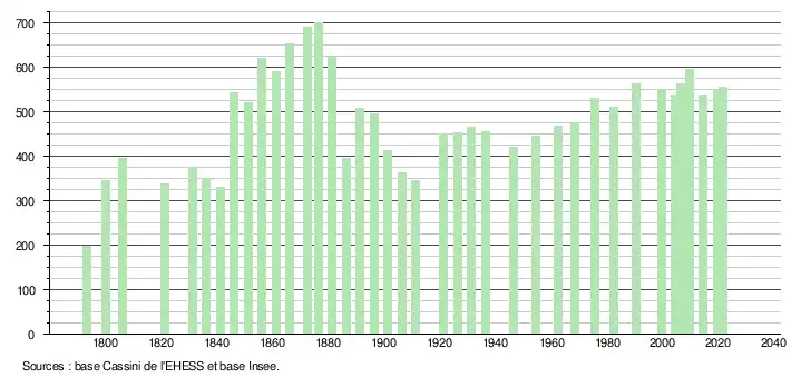 L'évolution du nombre d'habitants est connue à travers les recensements de la population effectués dans la commune depuis 1793. Pour les communes de moins de 10 000 habitants, une enquête de recensement portant sur toute la population est réalisée tous les cinq ans, les populations légales des années intermédiaires étant quant à elles estimées par interpolation ou extrapolation[20]. Pour la commune, le premier recensement exhaustif entrant dans le cadre du nouveau dispositif a été réalisé en 2004[21].