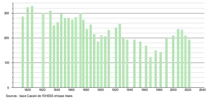 L'évolution du nombre d'habitants est connue à travers les recensements de la population effectués dans la commune depuis 1793. Pour les communes de moins de 10 000 habitants, une enquête de recensement portant sur toute la population est réalisée tous les cinq ans, les populations légales des années intermédiaires étant quant à elles estimées par interpolation ou extrapolation[25]. Pour la commune, le premier recensement exhaustif entrant dans le cadre du nouveau dispositif a été réalisé en 2006[26].