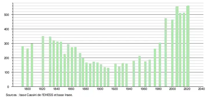 L'évolution du nombre d'habitants est connue à travers les recensements de la population effectués dans la commune depuis 1793. Pour les communes de moins de 10 000 habitants, une enquête de recensement portant sur toute la population est réalisée tous les cinq ans, les populations légales des années intermédiaires étant quant à elles estimées par interpolation ou extrapolation[21]. Pour la commune, le premier recensement exhaustif entrant dans le cadre du nouveau dispositif a été réalisé en 2005[22].