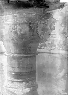 Son aspect a évolué au fil du temps, au XIIe siècle, le premier élément a été la cuve, ornée de deux masques humains, d’un personnage la tête en bas, et d’une harpie, qui a été placée sur une colonne. Il y avait également sur la face sud une fleur de lys, et sur la face ouest un écusson uni.