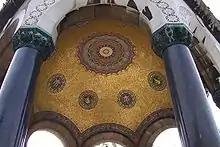 La fontaine octogonale de style néo-byzantin se dresse sur une base avec huit marches s'élevant jusqu'à une porte d'entrée. Il y a sept jets de fontaine en laiton sur les bassins sur les côtés restants, et au-dessus du bassin central il y a un dôme soutenu par huit colonnes de porphyre [6],[9]. Le bassin central de la fontaine se dresse sur une plate-forme en mosaïque et surmonté du dôme en bronze, qui est élevé sur des arches en marbre sculpté. Huit monogrammes dans la pierre de l'arche représentent l'union politique d'Abdülhamid II et de Wilhelm [7]. La fontaine était entourée d'une clôture en bronze, mais malheureusement celle-ci a été perdue. L'extérieur du dôme est en bronze richement modelé; le plafond du dôme est décoré de mosaïques dorées et du tughra d'Abdülhamid II et du symbole de Guillaume II.