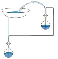 L'eau, contenue dans l’assiette étant à un plus haut niveau d'énergie potentielle, va remplir par gravité le ballon situé tout en bas. Durant cette opération, l'air contenu dans le ballon du bas (étanche) est chassé pour rejoindre celui du haut. En arrivant au niveau du ballon supérieur, l'air sous pression chasse l'eau, ce qui a pour effet de former un jet.