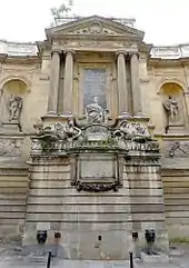 Une importante inscription latine en l'honneur de Louis XV surmonte un groupe sculpté. Le passant est d'abord surpris et ne voit pas du premier abord la nature de fontaine du monument car seuls les quatre mascarons de bronze représentant une tête de monstre marin, plaqués sur le soubassement à cinquante centimètres du sol, démontrent cette fonction. L'aspect architectural fait plutôt penser à une façade d'hôtel particulier ou d'église, mais tout cela est factice car les deux portails fermés ne donnent accès qu'à un jardin attenant au musée Maillol pour celui de droite et à un immeuble moderne contigu pour celui de gauche. De plus, la rue étant assez étroite, on manque de recul pour apprécier dans de bonnes conditions un si grand monument.